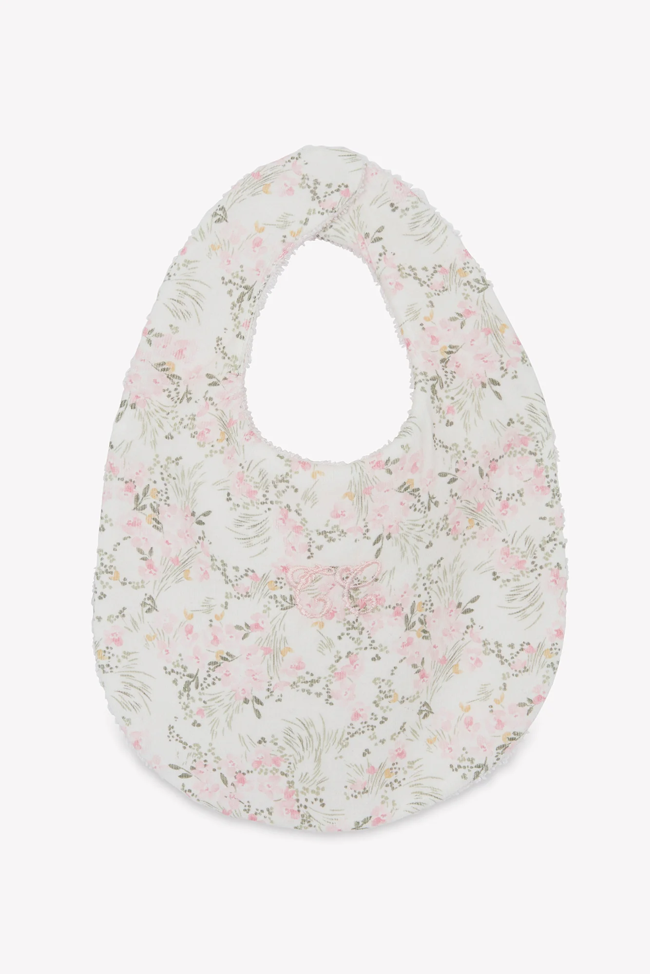 Bavoir imprimé fleuri inspiré d’un Jardin Hivernal. Fermeture avec bouton pression.