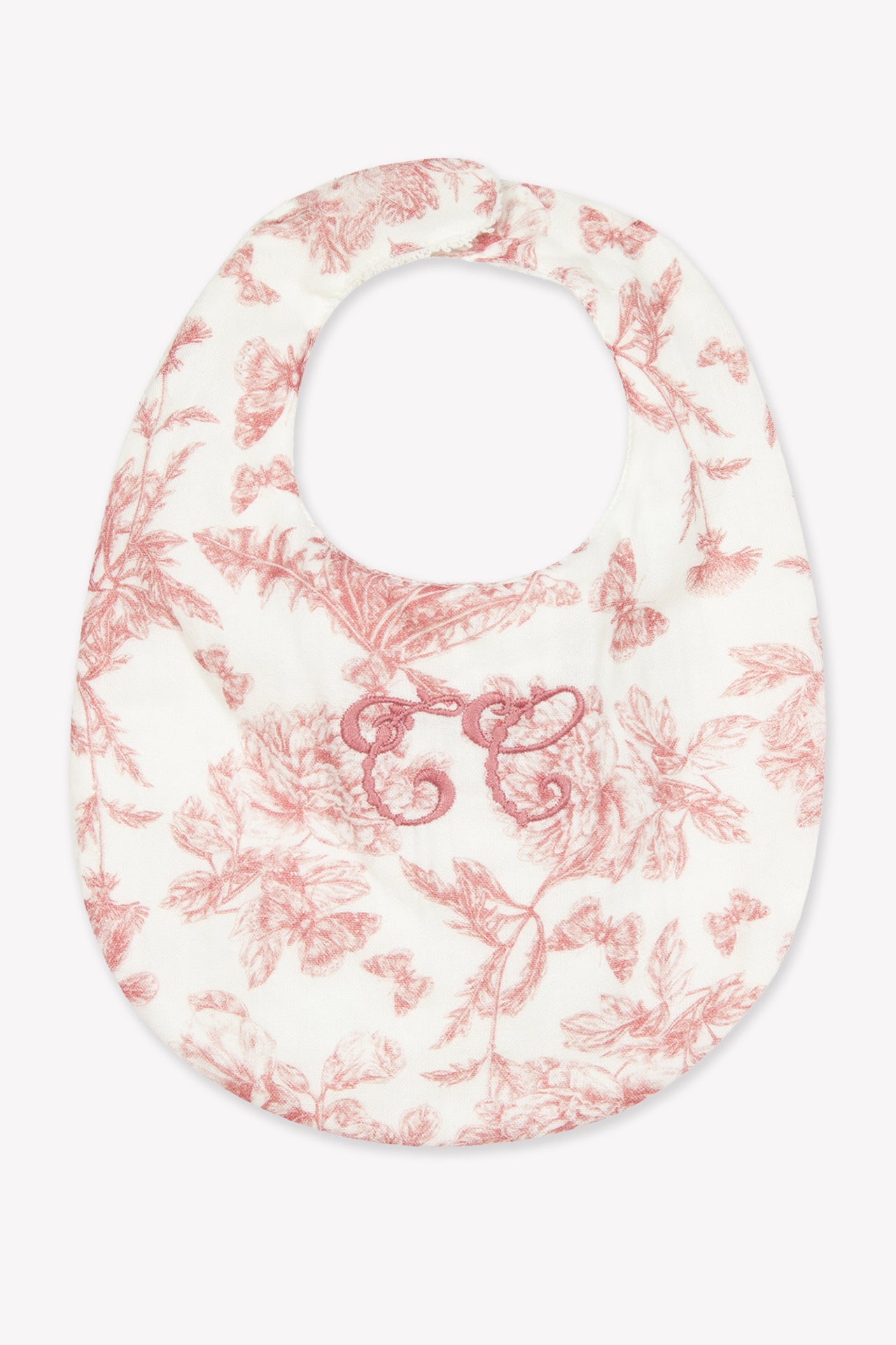 Bavoir en imprimé Toile de Jouy rose dessiné par Tartine et Chocolat. Fermeture avec bouton pression.