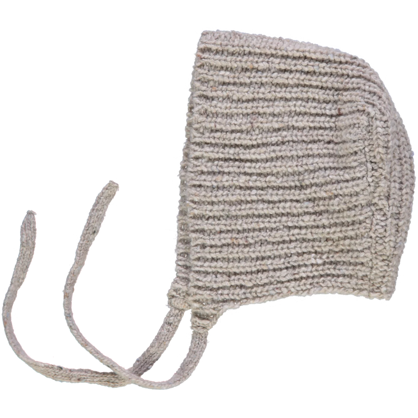 Béguin avec cordon de serrage. Son lien permet à bébé de ne pas l’enlever tout seul. Indispensable en toute saison. En laine recyclée & fil écologique.