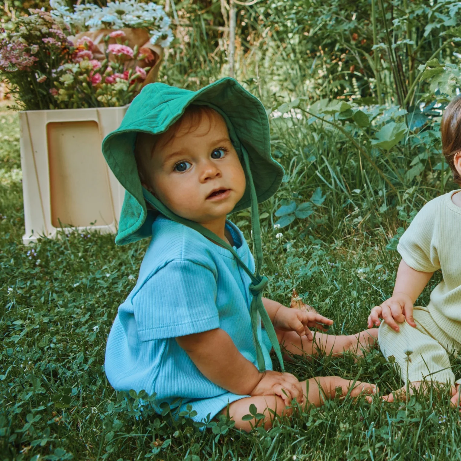 Chapeau avec cordon de serrage. Facile à nouer, il tient sur la tête ! 100% coton issu de l’agriculture biologique.