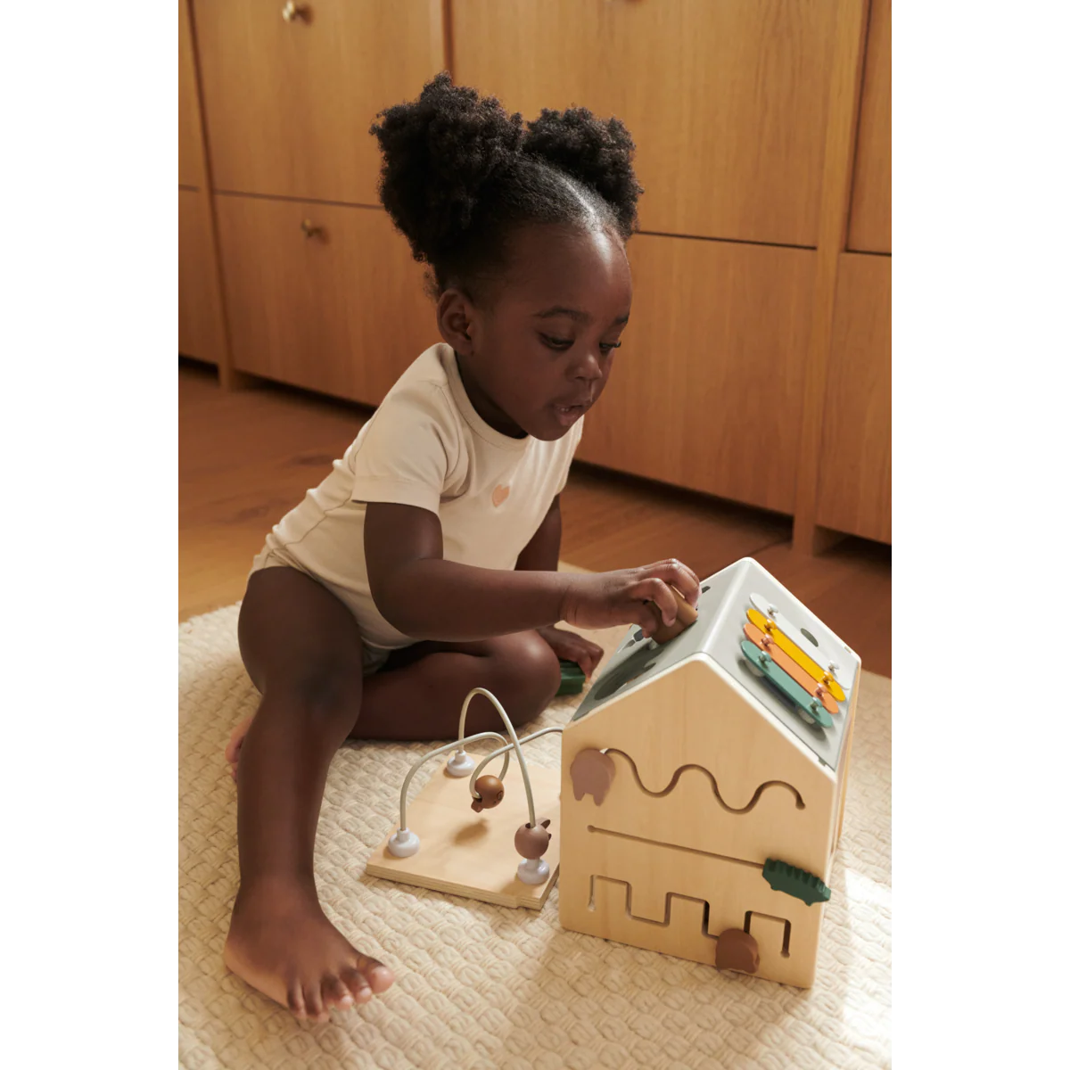 En forme d’une petite maison ludique, le cube d’éveil en bois LUCAS garantit des heures de plaisir pour les petits. Du xylophone sur le toit à la boîte puzzle, en passant par le miroir rotatif, le labyrinthe de perles et la porte cachée, chaque côté offre une surprise. Conçu pour soutenir le développement de la motricité fine et éveiller la curiosité des jeunes enfants.