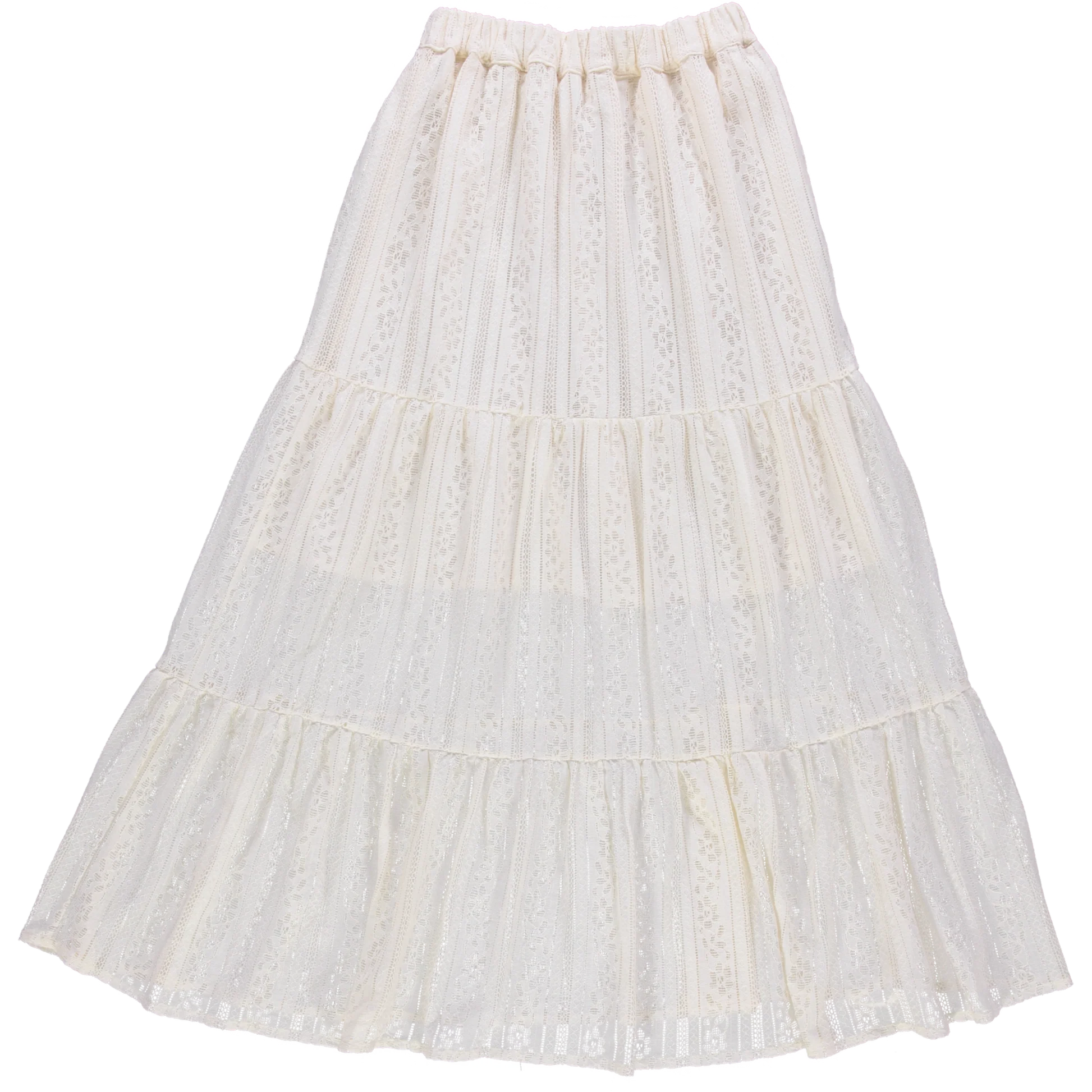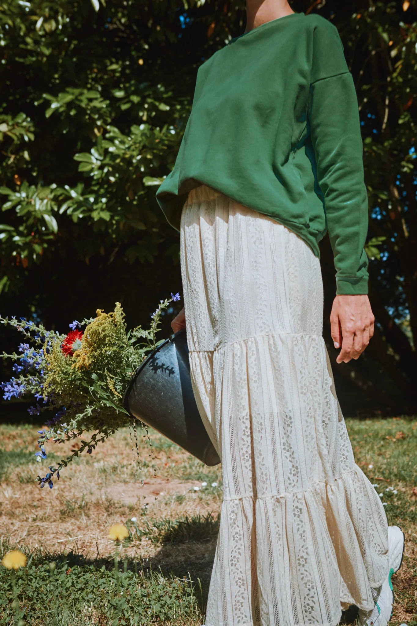 La jupe Tonka pour femme est confectionnée en dentelle composée à 70 % de coton biologique et à 30 % de nylon, issue d’un stock déjà existant.