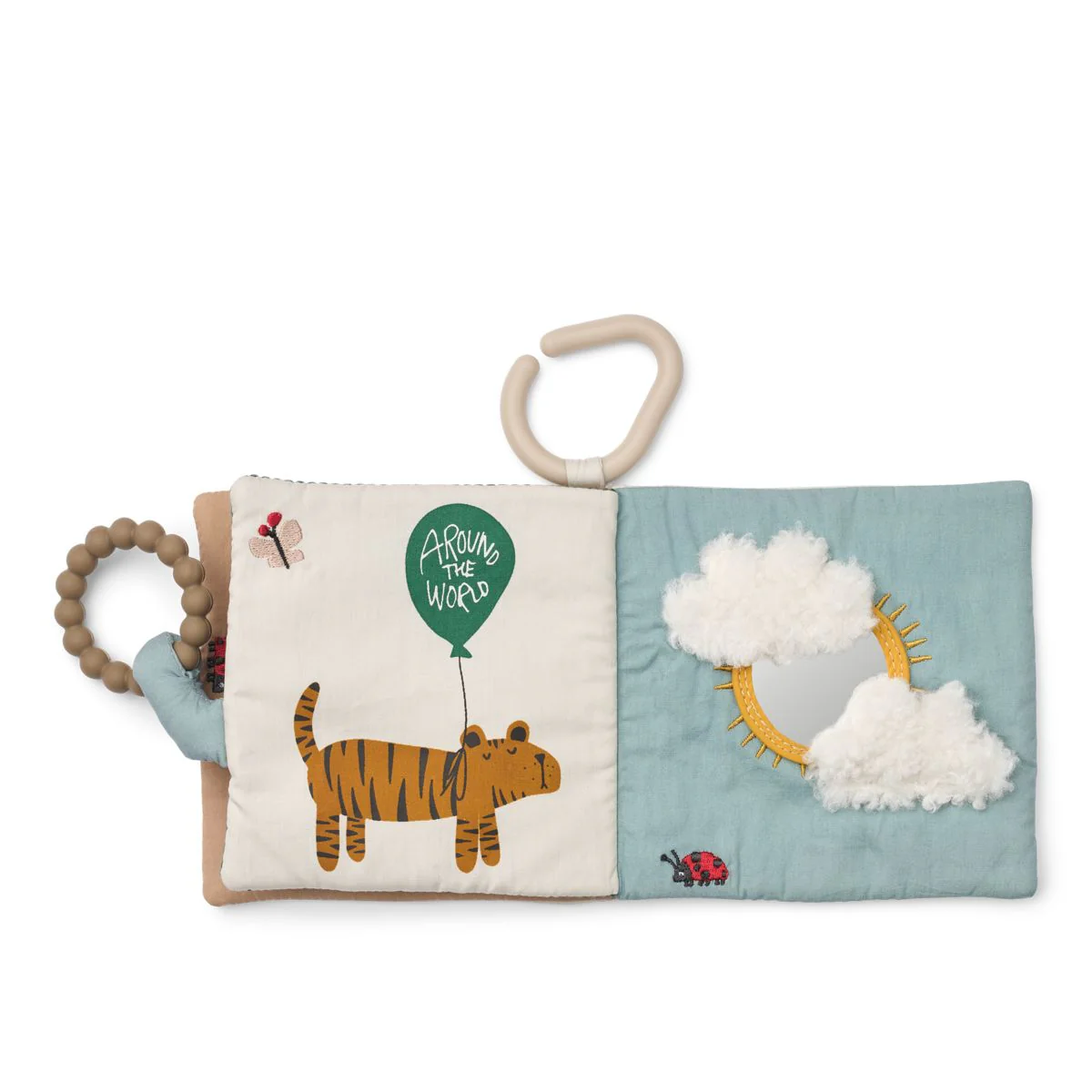 Le livre d’histoires en tissu FEY invite les petites mains à explorer ses pages douces remplies d’animaux adorables et de détails interactifs. Fabriqué à partir de matériaux recyclés, il comprend un miroir, des textures froissées et un anneau de dentition en silicone, pensés pour stimuler le jeu sensoriel et accompagner en douceur le développement précoce.